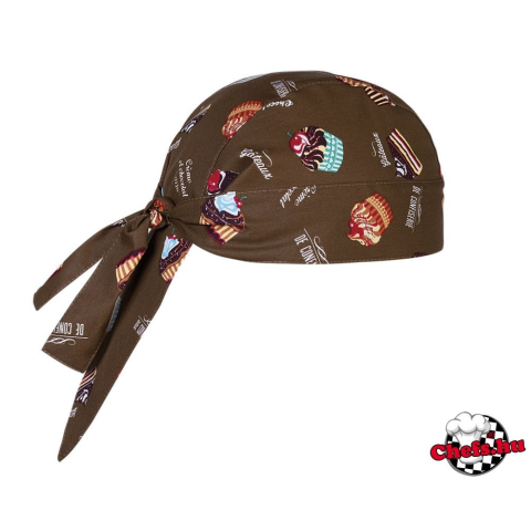 Uniszex fejkendő, bandana kendő, mérete hátul kötővel állítható. Anyag: 100% pamut, 180 g/m2 Szín: barna, torta mintával A feltüntetett árak bruttó árak, amik már tartalmazzák az ÁFA értékét!