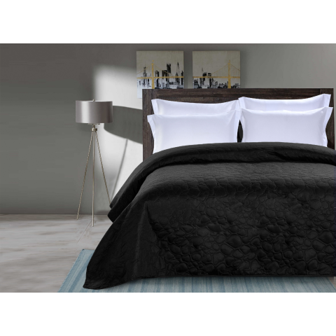 Elegáns fekete ágytakaró megvédi az ágyneműt, takarókat és párnákat a portól. A meleg éjszakákon könnyű takaróként szolgál. A steppelt mintázat, amely kavicsokra emlékeztet, stílusos megjelenést kölcsönöz az ágynak, amely könnyen alkalmazkodik bármely belső térhez.