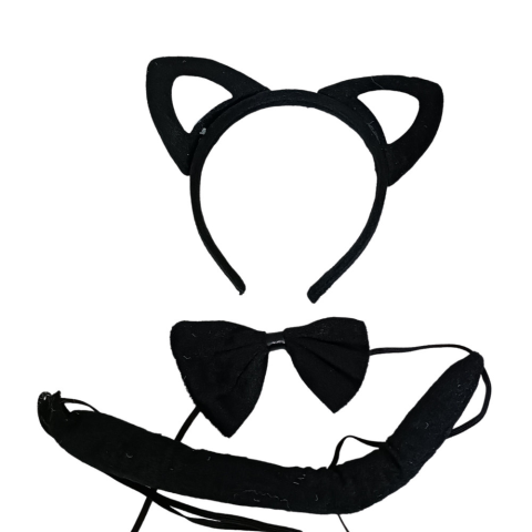 Fekete farsangi cica szett, 3 részes Füles hajpánt farkinca nyakkendő