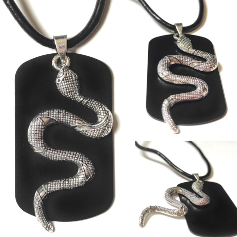 1 kép Fekete dögcédula ezüst színű kígyóval, duplamedál bőr lánccal vagy kulcstartóval