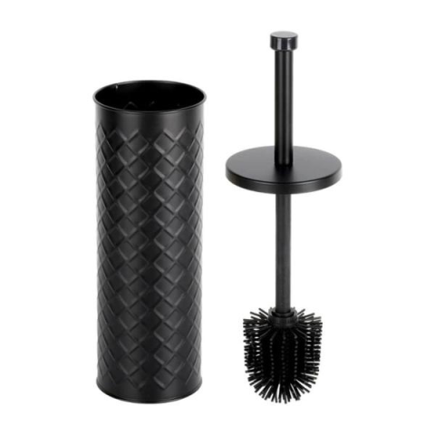 Fekete Fém WC-Kefe Szilikon Fejjel – Modern Gyémánt Mintás Kivitel 567060Cserélje le hagyományos toalettkeféjét erre a modern, prémium megjelenésű tisztítóeszközre. A szett egy stabil fém tartályból és egy speciális szilikon fejjel ellátott keféből áll. A tartály felületét dekoratív, dombornyomott gyémánt mintázat díszíti, amely a matt fekete színnel párosulva stílusos kiegészítővé teszi bármelyik modern vagy indusztriális stílusú fürdőszobában és