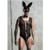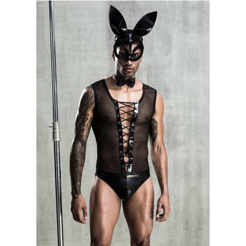 Fekete férfi nyuszi szett.Elöl fűzős body rugalmas anyagból(alul vizes hatású anyag,felül áttetsző,lakk csíkkal).Nyuszi maszk fülekkel.Nyakpánt.Nyuszi farok.