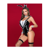 Fekete lakk nyuszi szett.Hátul zippzáras lakk felső.Elöl fehér betéttel.Állítható pántokkal,csillogó gombokkal.Nyuszi fejpánt.Csillogó csokornyakkendő.Csillogó csuklópántok.Bojtos fehér nyuszifarok.Combfix.