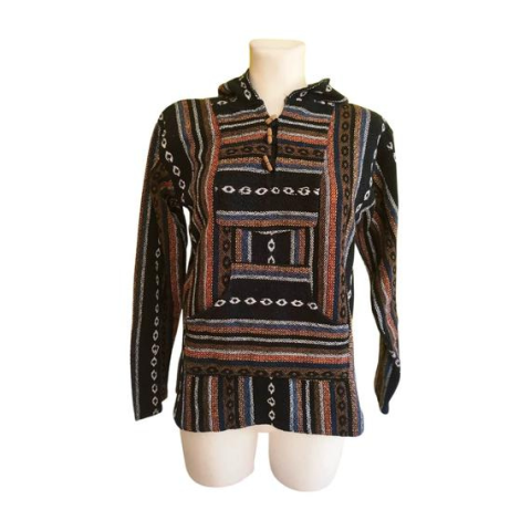 Ez a fekete mintás bohém női pulóver egy nagyszerű darab, ami jól kombinálható egy kényelmes farmerrel vagy laza kiegészítőkkel. Strapabíró pamut anyaga miatt nagyon sokoldalú viselet. Fazonja klasszikus, kapucnis. Kiváló választás egy