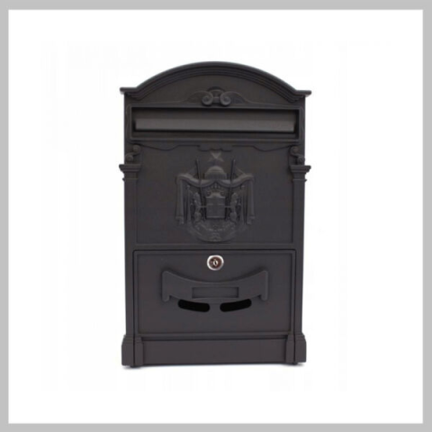 Fekete oroszlános postaláda SNK22Alumíniumból készült postaláda hengeres zárral, elektrosztatikus térben festve, víz-, magas hőmérséklet- és korrózióálló. A postaládához rögzítőcsavarok tartoznak.A levelek postaládába történő elhelyezése a postaláda elején lévő nyíláson keresztül történik, és a nagy méreteknek köszönhetően A4-es borítékok is behelyezhetők.A postafiókban lévő levelezéshez a nyílás alatt elhelyezett, 2 kulcsos hengeres zárral el