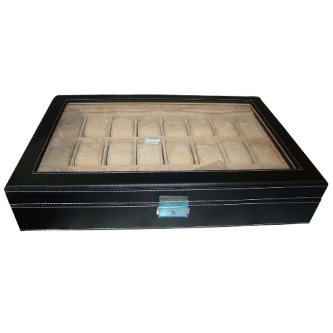 Varrott fekete óratartó doboz 24 órához. Extra nagy óratartó, kiváló minőségű mesterséges bőrből, gyönyörű fehér varrással. Belseje plüss, bézs színű. Kialakításának köszönhetően akár 50 mm átmérőjű órákat is rakhat egymás mellé! Ezüst színű stabil zsa