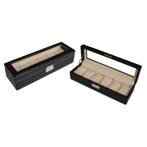 Varrott óratartó doboz 6 órához fekete színben. Extra nagy óratartó gyönyörű fehér varrással. Belseje plüss, bézs színű! Kialakításának köszönhetően akár 50 mm átmérőjű órákat is rakhat egymás mellé! Ezüst színű stabil zsanér, zárható, 1 db kulcs tartozé