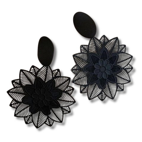 Fekete virágos fülbevaló, részletgazdag mandala hatással. Stílusos és elegáns választás minden alkalomra