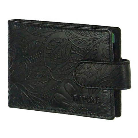1 kép Fektetett, kapcsos fekete, nyomott mintás bőr kártyatartó 24 db hellyel Farkas