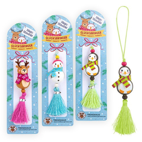 Felakasztható dísz Trendhaus Magic Moments karácsonyi figurás vegyes Vidám, fából készült figurák bojtokkal.Használható karácsonyfadíszként, kulcstartóként, cipzárdíszként.3 féle minta: rénszarvas, pingvin, hóember (a minta nem választható).Hossz: kb 1