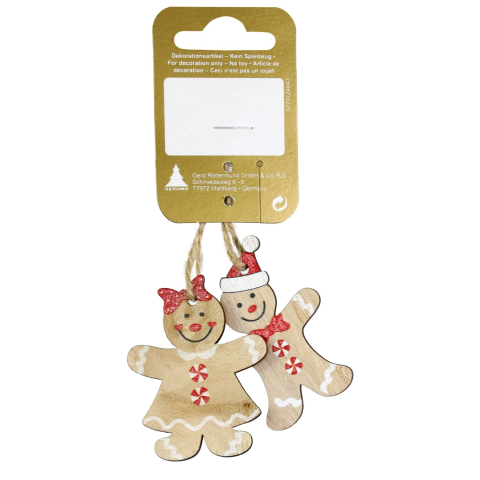 A két, fából készült, felakasztható mézeskalács figura sokoldalúan elhelyezhető. A felakasztható díszek barátságos, téli hangulatot árasztanak.