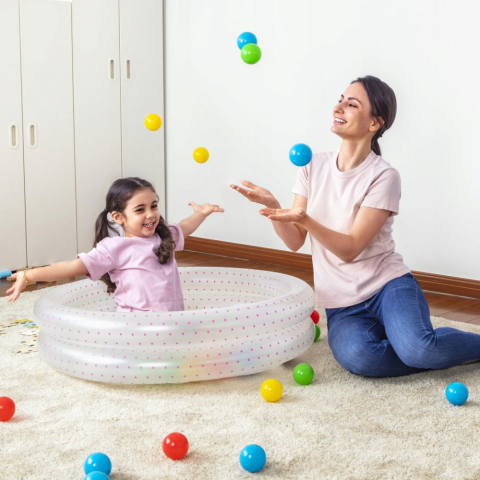 A felfújható kerti medence jellemzői: A termék két különböző módon használható: Az első lehetőség a száraz játék, amikor az időjárás nem teszi lehetővé a vizes szabadtéri tevékenységeket. A medencéhez labdák (50 darab) is tartoznak, amelyek nagyszerű szórakozást nyújtanak. Forró nyári napokon, pedig tökéletesen használható hűsítő medenceként is. A termék használatát 2 hónapos kortól 8 éves korig ajánljuk. Szigorúan csak szülői felügyelet melle