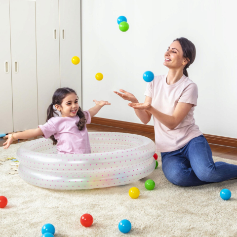 Felfújható kerti medence - 50 db műanyag labdával - 91 x 20 cm Ez a gyerekmedence kiváló megoldás a legkisebb gyermekek számára. Magas minőségű PVC anyagból készült, ami ellenáll a kisebb sérüléseknek. Az érdekes minták a felületen biztosan ösztönzik m