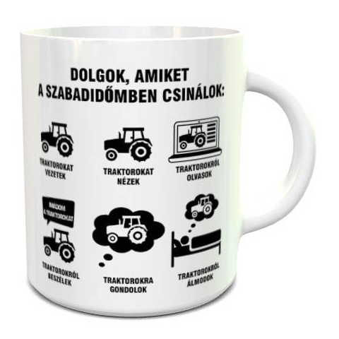 Bögre traktorosnak, traktorosok szabadideje. Humoros bögre feliratokkal, amik egy igazi traktoros életét mutatják. Ha tudod, hogy rokonod, barátod szabadidejét is a traktoroknak szenteli, ajándékozd meg születésnapján, karácsonykor egy ilyen bögrével. Vál