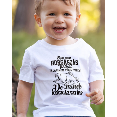 Vicces pecás gyerek póló, horgászat nélkül. Megszállott horgászoknak. Egy nap horgászás nélkül talán nem végez velem, de minek kockáztatni? felirattal. Lepd meg vele családtagodat, ismerősödet egy kényelmes pamut gyerek pólóval. Minőségi gyerek pólóink