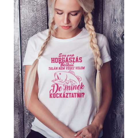 Vicces pecás női póló, horgászat nélkül. Megszállott horgászoknak. Egy nap horgászás nélkül talán nem végez velem, de minek kockáztatni? felirattal. Lepd meg vele családtagodat, ismerősödet egy kényelmes pamut női pólóval. Kiváló minőségű férfi és női