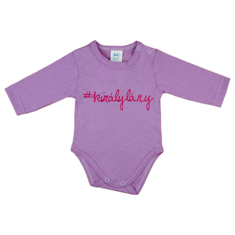 Ezzel a feliratos hosszú ujjú baba bodyval igazán trendi lesz a kicsi! A lila színű, vállon patentos kialakítású kombidresszben minden pillanat kényelmes és mókás lesz. Különlegessége, hogy felirat díszíti, ami extra stílusos megjelenést kölcsönöz neki. M