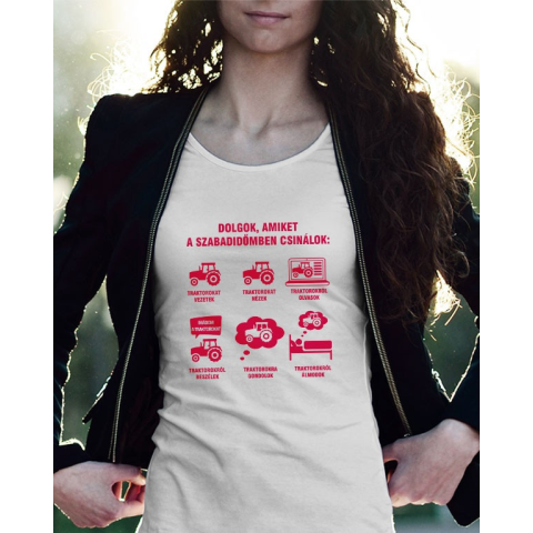 Női póló traktorosnak, traktorosok szabadideje. Humoros női póló feliratokkal, amik egy igazi traktoros életét mutatják. Ha tudod, hogy rokonod, barátod szabadidejét is a traktoroknak szenteli, ajándékozd meg születésnapján, karácsonykor egy ilyen női pól