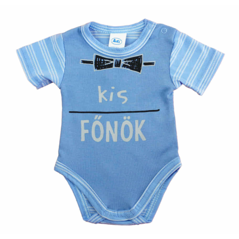 Feliratos rövid ujjú baba body Ezzel a vállon patentos, kék színű baba bodyval a kisbabád mindig stílusos lesz. A body feliratos, ami egyszerre vicces és aranyos. Az 100% pamut anyaga garantálja a kényelmet, és a nikkelmentes patentoknak köszönhetően nem
