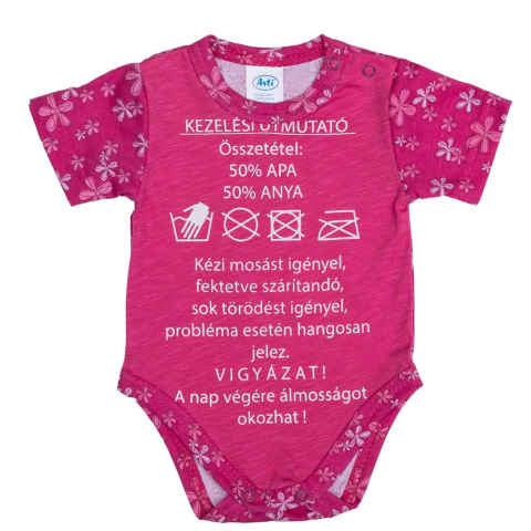 Feliratos rövid ujjú baba body Ezzel a vállon patentos, pink virágos baba bodyval a kisbabád mindig stílusos lesz. A body feliratos, ami egyszerre vicces és aranyos. Az 100% pamut anyaga garantálja a kényelmet, és a nikkelmentes patentoknak köszönhetően