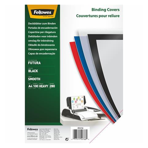 Hátlap, A4, 280 mikron, polipropilén, matt, FELLOWES Futura, fekete - Polipropilén matt hátlap spirálkötéshez - A4 méretben - Kiszerelés: 100 lap/csomag - Vastagság: 280 mikron - Szín: fekete Gyártó/első EU forgalmazó elérhetősége: Fellowes Holdin