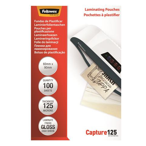Meleglamináló fólia, 125 mikron, 60x90 mm, fényes, 100 db, FELLOWES - Méret: 60x90 mm - Vastagság: 125 mikron - Felület: fényes - Védelem szintje: fokozott - Alkalmazható pl. személyi igazolványok, hitelkártyák, üzleti kártyák és vendégkártyák laminálá