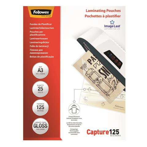 Meleglamináló fólia, 125 mikron, A3, fényes, 25 db, FELLOWES - Méret: A3 - Vastagság: 125 mikron - Felület: fényes - Védelem szintje: fokozott - Alkalmazható pl. értesítések, fényképek, tanúsítványok laminálására, továbbá hobbi és kézművesség területen