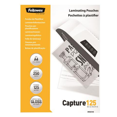 Meleglamináló fólia, 125 mikron, A4, fényes, 250 db, FELLOWES - Méret: A4 - Vastagság: 125 mikron - Felület: fényes - Védelem szintje: fokozott - Alkalmazható pl. értesítések, fényképek, tanúsítványok laminálására, továbbá hobbi és kézművesség területe