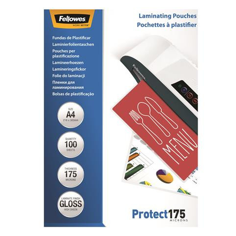 Meleglamináló fólia, 175 mikron, A4, fényes, 100 db, FELLOWES - Méret: A4 - Vastagság: 175 mikron - Felület: fényes - Védelem szintje: prémium - Alkalmazható pl. értesítések, fényképek, tanúsítványok, menük laminálására, továbbá hobbi és kézművesség te