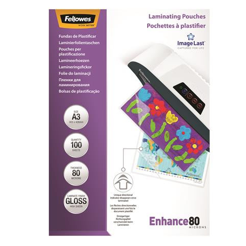 Meleglamináló fólia, 80 mikron, A3, fényes, 100 db, FELLOWES - Méret: A3 - Vastagság: 80 mikron - Felület: fényes - Védelem szintje: alap - Alkalmazható pl. értesítések, fényképek laminálására - Kiszerelés: 100 db/csomag - A tökéletes végeredmény és a
