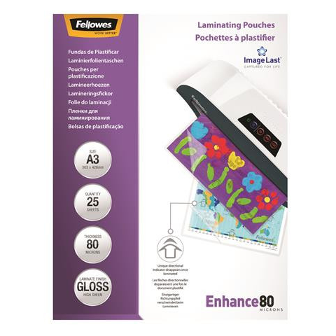 Meleglamináló fólia, 80 mikron, A3, fényes, 25 db, FELLOWES - Méret: A3 - Vastagság: 80 mikron - Felület: fényes - Védelem szintje: alap - Alkalmazható pl. értesítések, fényképek laminálására - Kiszerelés: 25 db/csomag - A tökéletes végeredmény és a k