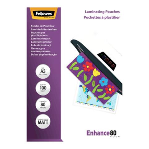 Meleglamináló fólia, 80 mikron, A3, matt, 100 db, FELLOWES - Méret: A3 - Vastagság: 80 mikron - Felület: matt - Védelem szintje: alap - Alkalmazható pl. értesítések, fényképek laminálására - Kiszerelés: 100 db/csomag - A tökéletes végeredmény és a kie