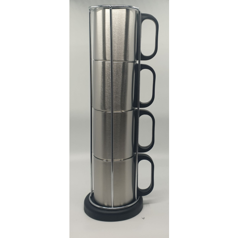 4 db fém kávés bögre állvánnyal. Praktikus ajándék nőknek, férfiaknak egyaránt születésnapra, névnapra vagy bármilyen ünnepi alkalomra. A szett tartalma: 4 db fém kb. 1,5 dl űrtartalmú bögre, fém állvány.