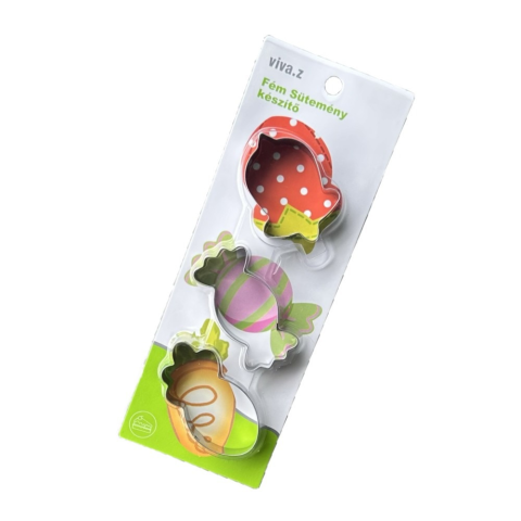 \nEz a háromrészes fém kiszúró szett különleges cukor, répa és eper formákkal teszi izgalmassá a sütést. Ideális választás kekszek, mézeskalácsok, fondant vagy marcipán formázásához, de akár kreatív kézműves projektekhez is használható.