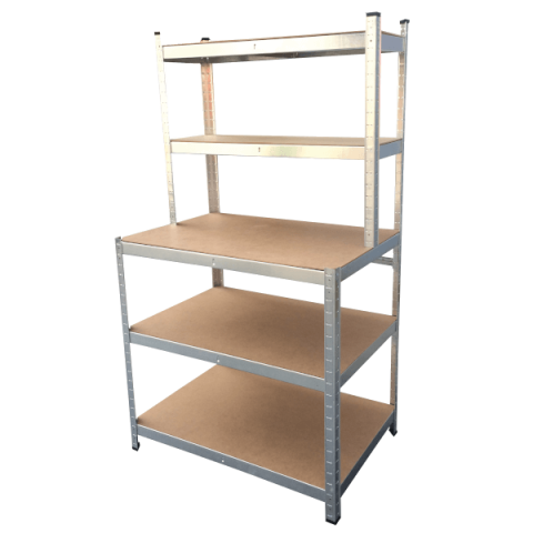 Fémpolc munkapaddal, 5 mdf polccal. Mérete 156x90x30/60 cm.