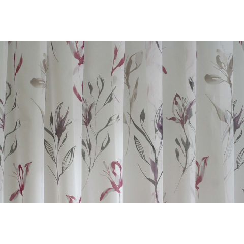 Telemintás, nyomott, színes voile (voál), stilizált, indaszeűen felfelé kúszó virág- és levélmotívumokkal. A függönyt az áruházban az Ön által kívánt méretre vágják.