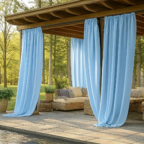Fényáteresztő függöny kék 2 db 132x215 QB1096473-vk132215Méret: 132 x 215 cm ( 2x) Szín: világos kékEz a stílusos, világos színű függöny ideális választás pergolákhoz, teraszokhoz vagy kerti pihenőhelyekhez. A vastag, mégis lágy esésű textil hatékonyan árnyékol, miközben meghitt, elegáns légkört teremt a szabadtéri térben.Főbb jellemzők:Anyag: UV-álló, időjárásálló szövet, amely ellenáll a napsütésnek és az enyhe csapadéknakSzín: Klasszikus vil
