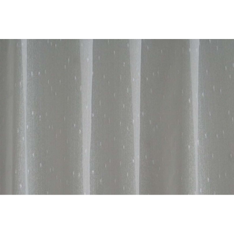 Fehér fényáteresztő függöny apró beszövésekkel. Ólomzsinóros, összetétele poliészter. A függönyt az áruházban az Ön által kívánt méretre vágják.
