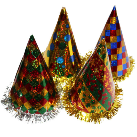 Papír kalap, hologramos mintás, boával díszítve. Magassága 24 cm. Fejrésznél átmérő 16 cm. Hozzá adott gumifonallal rögzíthető a fejhez.
