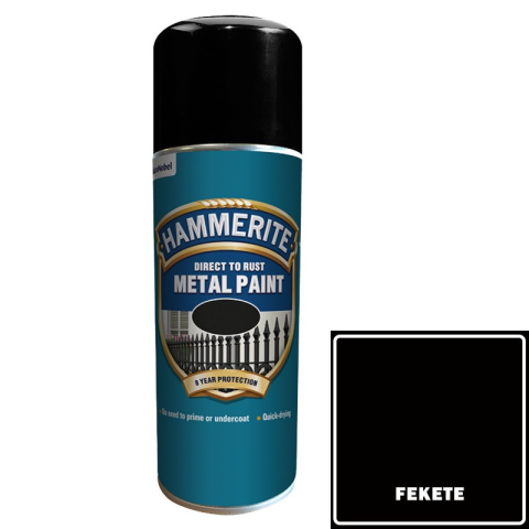 FÉNYES FEKETE - HAMMERITE KÖZVETLENÜL A ROZSDÁRA SPRAY - 400ML KÖZVETLENÜL A ROZSDÁRA SPRAY – KALAPÁCSLAKK - használható: Ajtó, Garázskapu, Kerítés, Kertibútor, Lépcsőkorlát. A Hammerite Spray-ek összetétele megegyezik a dobozban kapható fémvédő festékekk