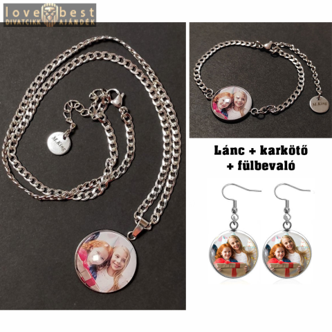 Fényképes ékszerszett (nyaklánc medállal, karkötő és fülbevaló) rozsdamentes acél kubai láncból (választható méretben, logóbilétával, márkadobozban). A nyakláncot M.King logózott ékszerdobozban szállítjuk! A képeket töltsd fel