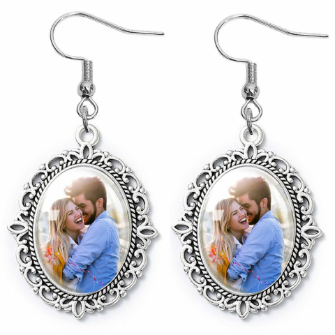 Látványos fényképes fülbevaló tibeti ezüst, ovális cirádás foglalattal, 4 cm-es nagy méretű, melyben a fénykép 18x25 mm-es.Ajándékdobozt adunk hozzá!A képet töltsd fel feljebb, a File feltöltővel! Ha mindkettő fülbevalóba ugyanazt