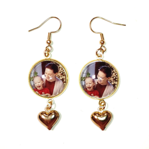 Ez a fényképes fülbevaló domború szívvel, rozsdamentes acélból, arany színben nagyon látványos fényképes ékszer.A fényképedet (akár egyféle kép kerül mindkét fülbevalóba, akár kétféle, egyiket az egyik fülbevalóba, másik fotó