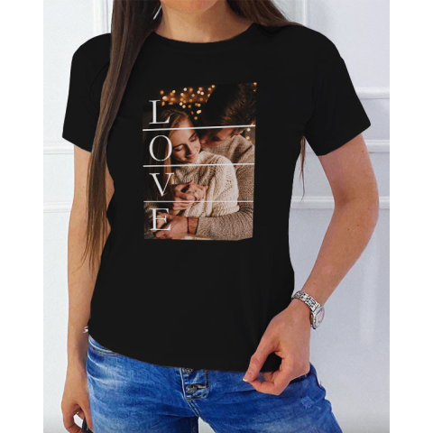 Fényképes női póló szerelmednek, Love. Szerelmes ajándék barátnőd születésnapjára, névnapjára, de akár Valentin napra is tökéletes meglepetés. Egyedi meglepetés kedvenc közös fotótokkal LOVE felirattal, kedves meglepetés annak, akit a legjobban szeretsz.