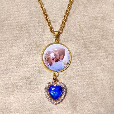 1 kép Fényképes nyaklánc kék strasszos szívvel, arany szín