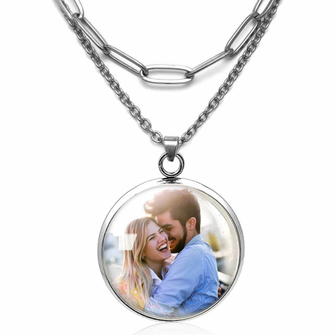 Kétféle láncból készült fényképes nyaklánc medállal, rozsdamentes acél.A hosszabb nyakláncra kerül a medál, a rövidebb lánc külön is hordható.Márkadobozban, logóbilétával szállítjuk.Kép és medál mérete 25 mm. (Nagy méret)A k