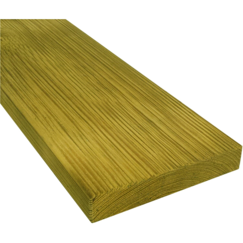 Mutatós, kétoldalt eltérő profilozású fenyőfa teraszpadló, 300 cm x 14,4 cm x 1,9 cm méretben. Egyik oldala finoman bordázott, a másik simára gyalult. A hosszú élettartam érdekében kazánnyomással zöldre impregnált.