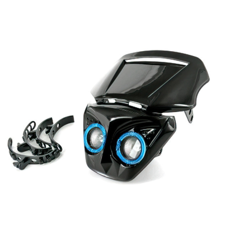 TNT Fényszóró Maszk ÁtalakítóA név mindent elmond: a TNT fényszóró maszk átalakító megváltoztatja a motorod elejét. Ez egy dupla fényszóró, két fényes halogén lámpával és további LED lámpákkal. A fényszóró négy gumiszalagot tartalmaz a rögzítéshez.Szín: f