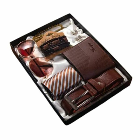 Férfi ajándékcsomag: barna pénztárca, öv, napszemüveg, karkötők és nyakkendő