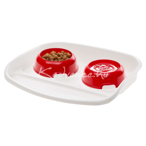 Praktikus tálca, amely 2 műanyag tállal van ellátva macskák és kutyák számára Ferplast Lindo etető-itató tál szettekKiválóan alkalmas a tiszta és rendezett állapot megőrzésére. A tálca egy alappal rendelkezik, amelyen a szőrös barátja felhelyezheti a
